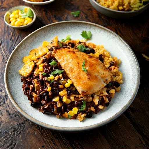 Blanc de volaille ‘’Santa Fe’’ servi sur riz aux haricots noirs et maïs en grain