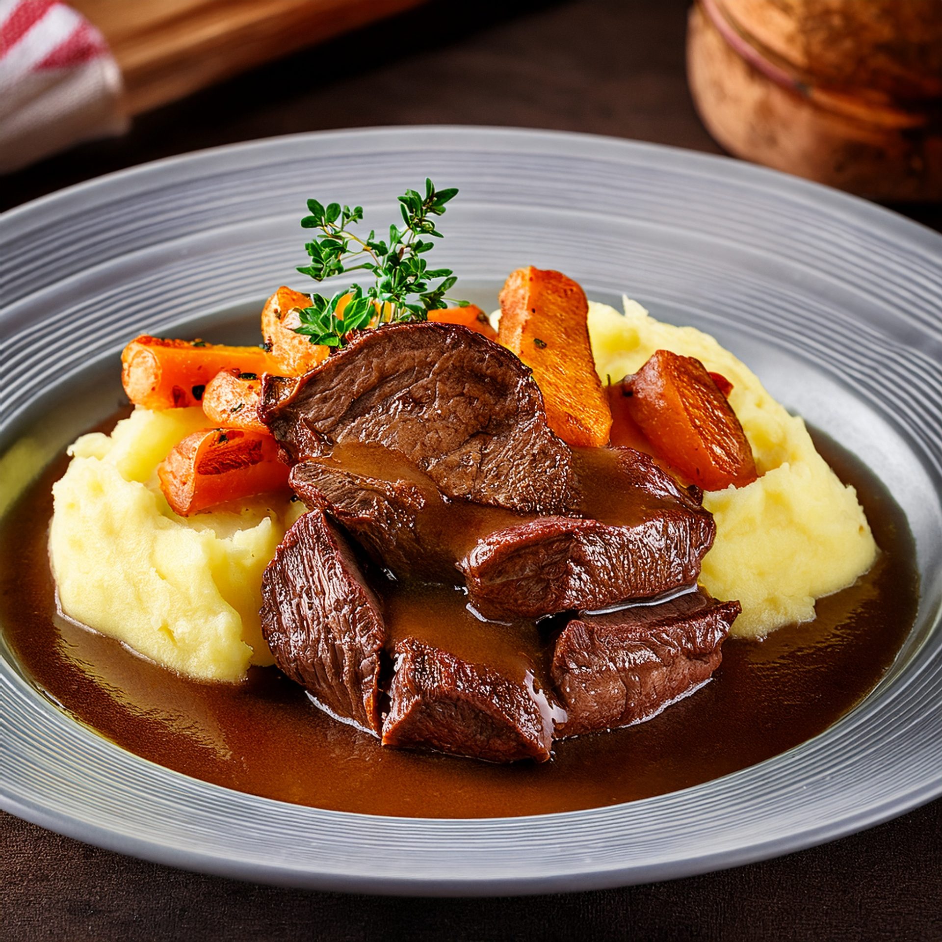 Braisé de bœuf aux oignons caramélisés, servi avec purée de pomme de terre et légumes racines