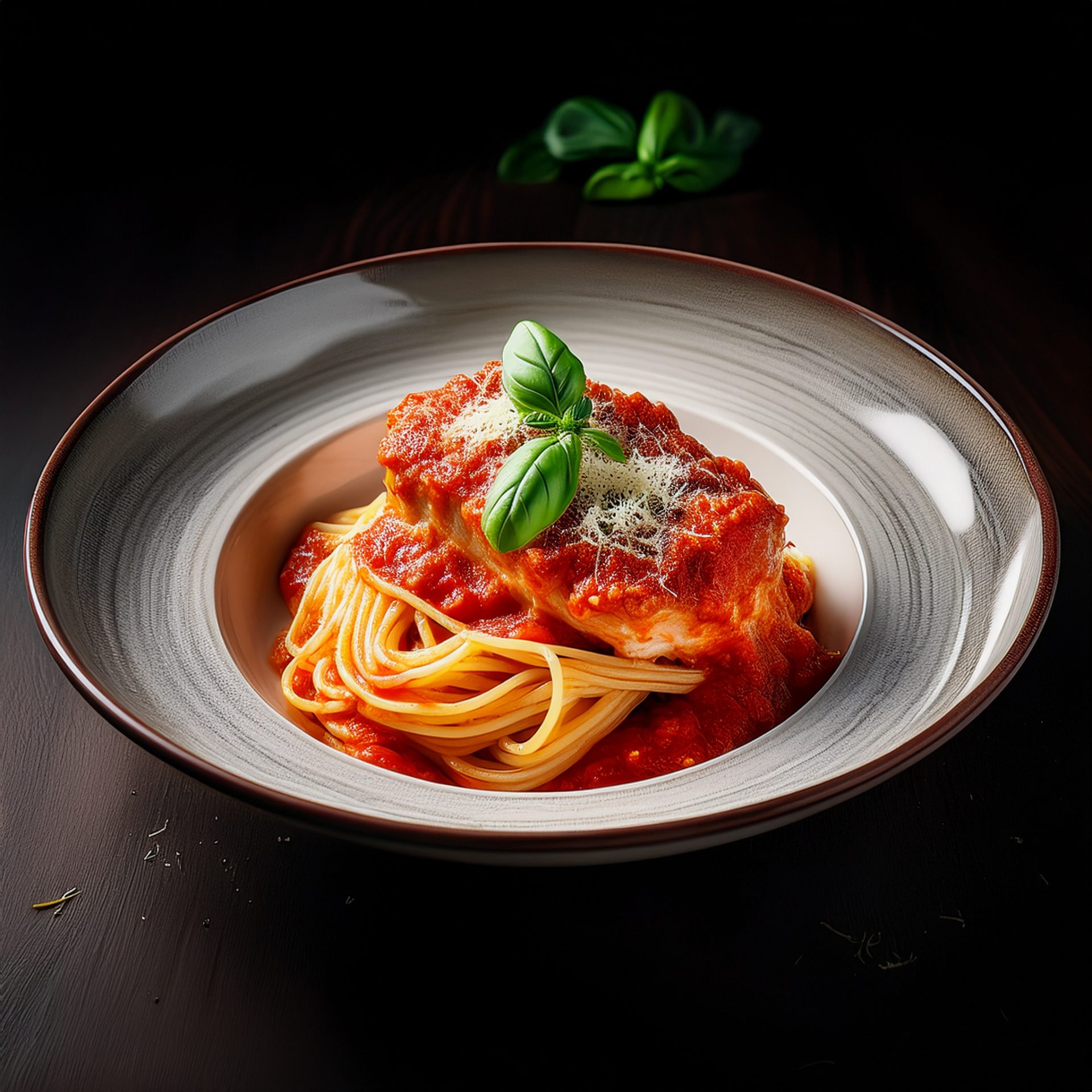 Escalope de porc parmigiana servi sur spaghetti sauce tomate