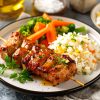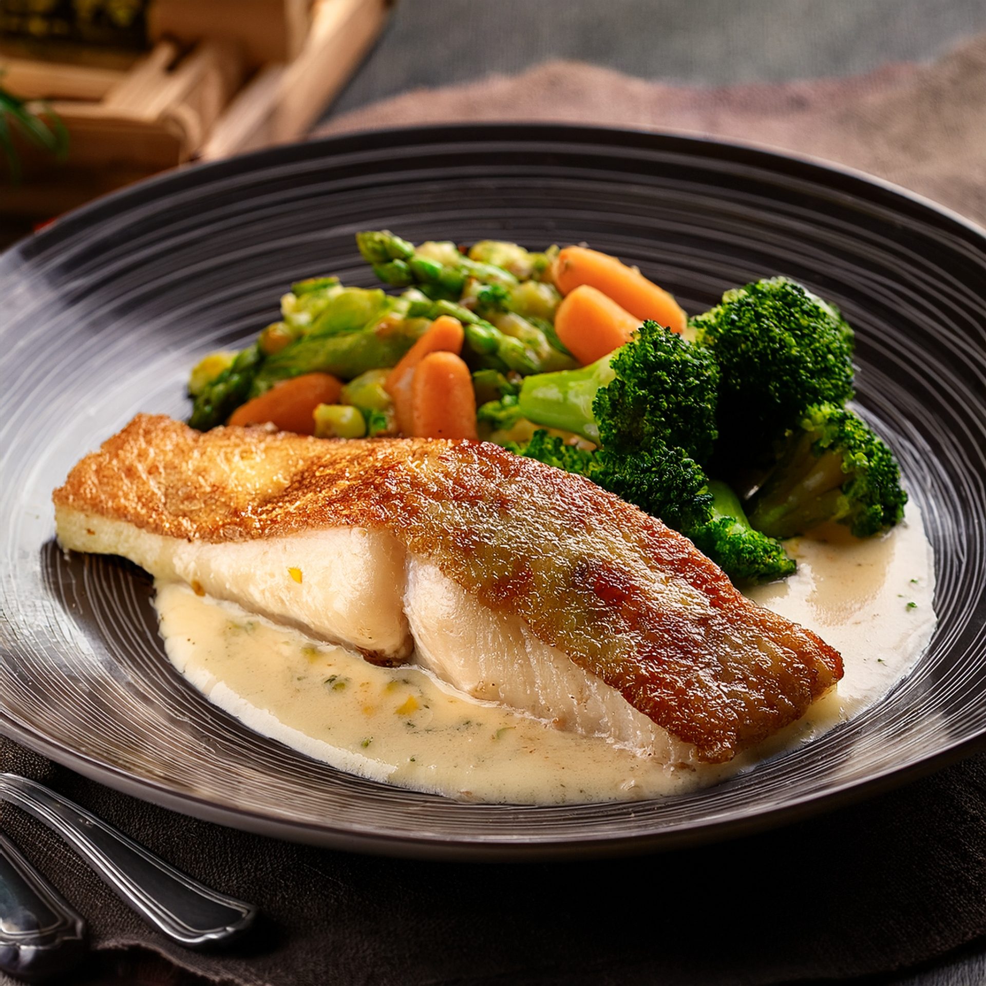 Filet de bassa, sauce béarnaise servi avec riz et légumes sautés