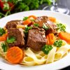 Filet de porc enrobé de bacon, sauce miel et ail, servi avec pomme de terre en purée et légumes