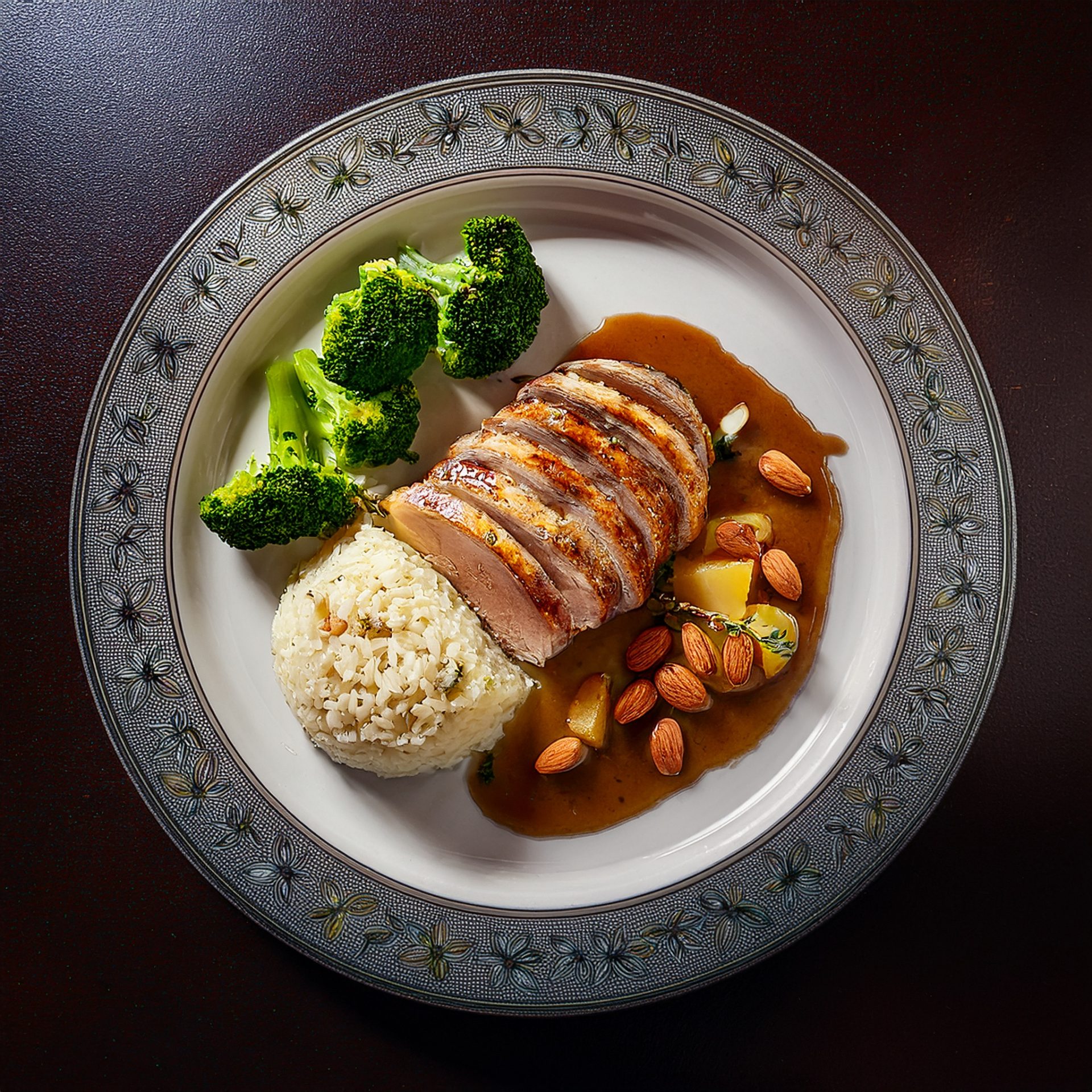 Filet de porc farci à la poire, amandes et fromage en grain, sauce au Brandy accompagné de riz basmati et légumes du marché