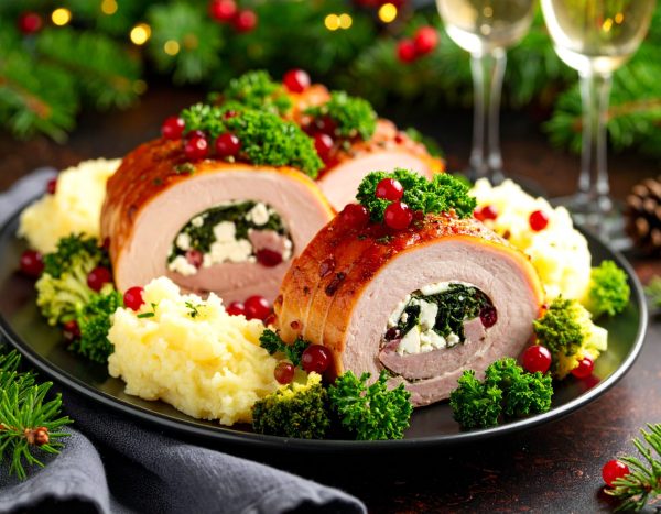 Filet de porc farci au jambon, épinard, feta et canneberge, servi avec pomme de terre en purée et légumes