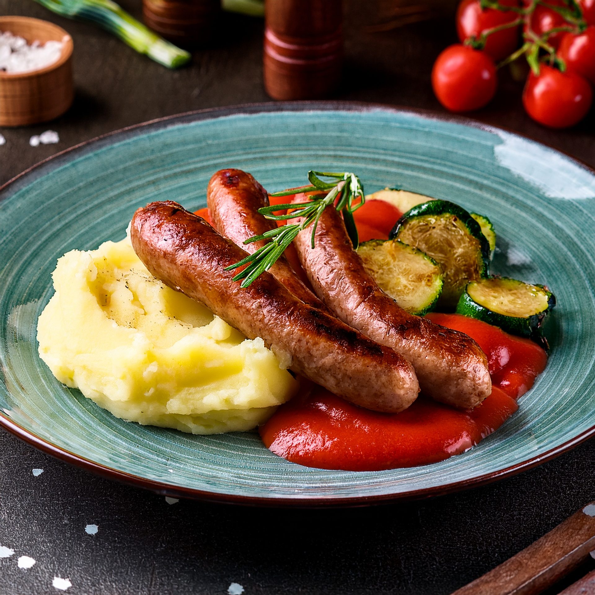 Mix grill de saucisse accompagné de pomme de terre en purée et légumes