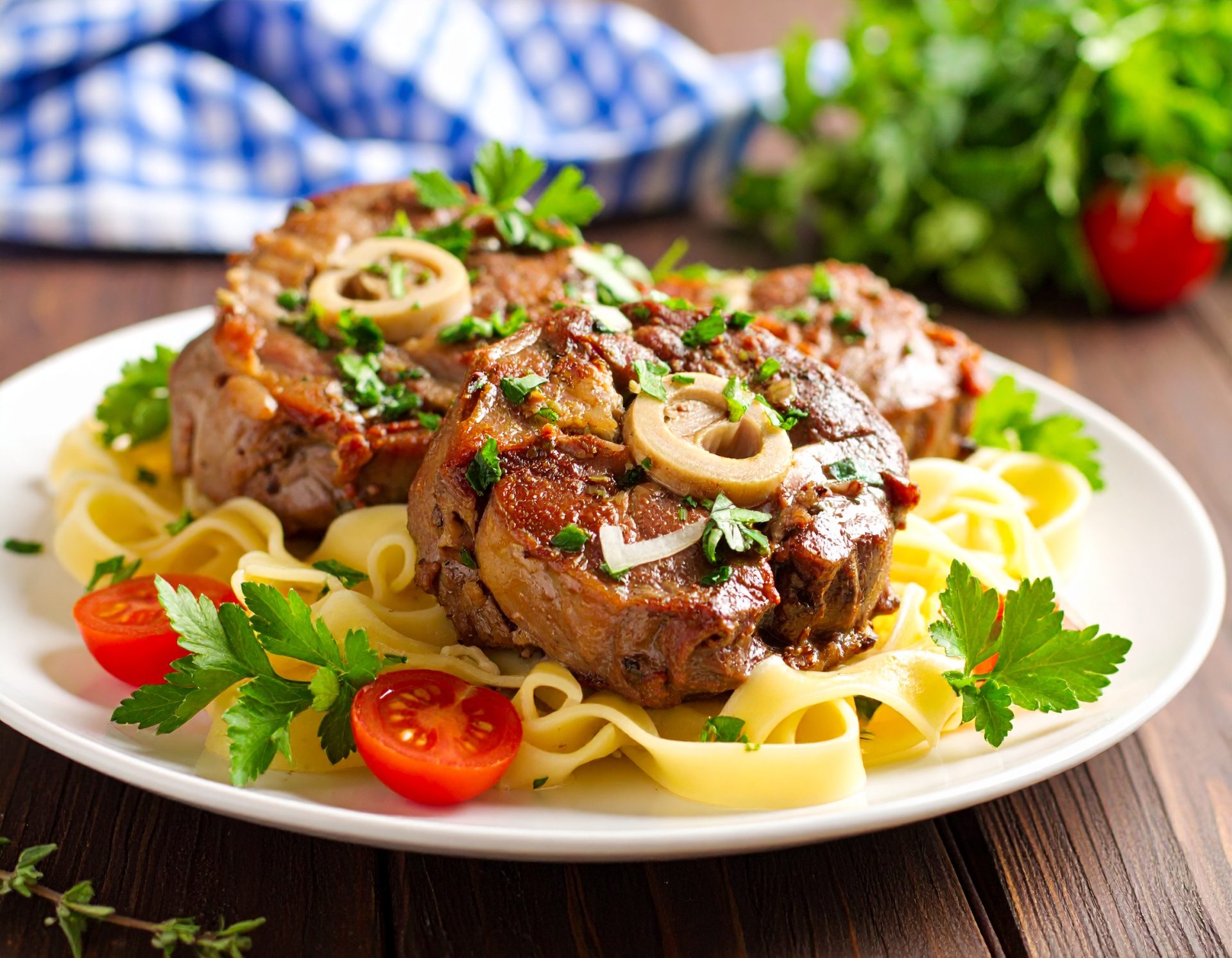 Osso Buco de porc à la Milanaise, servi sur tagliatelle aux fines herbes et légumes du marché