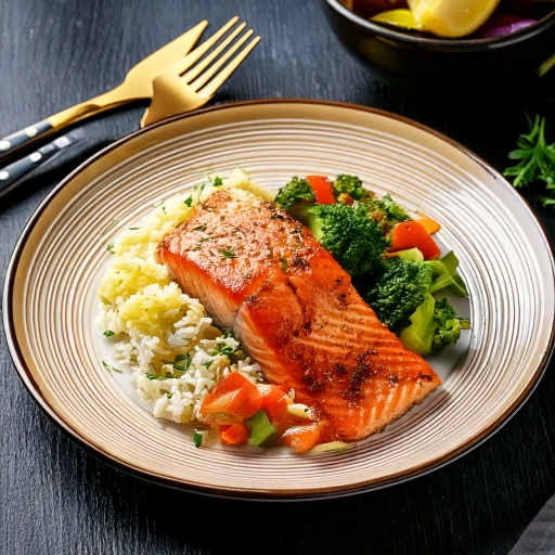 Pavé de saumon, sauce florentine accompagné de riz et légumes