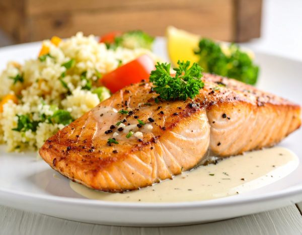 Pavé de truite, sauce Hollandaise, accompagné de couscous aux agrumes et légumes
