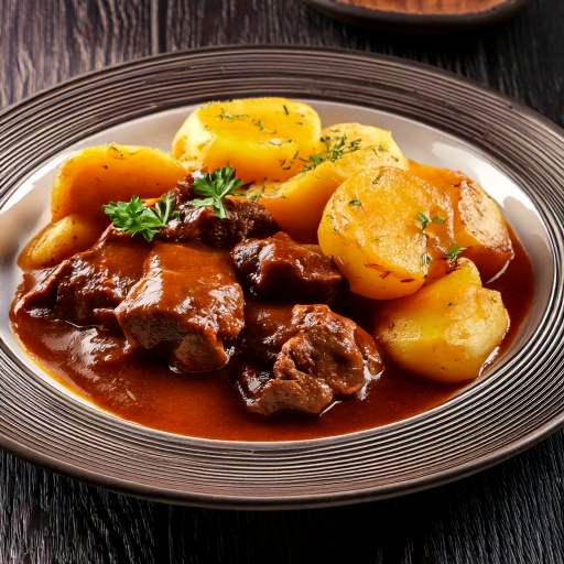 Ragoût de bœuf servi avec pomme de terre lyonnaise
