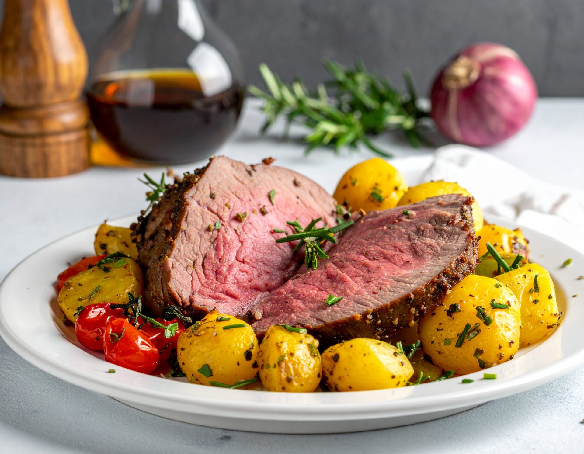 Rôti de boeuf aux herbes de Provence, servi avec pomme de terre style grec et légumes