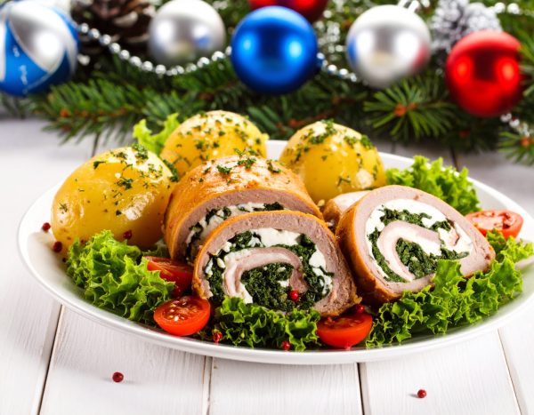 Roulade de bœuf, jambon, épinard et feta accompagné de pomme de terre au four et légumes