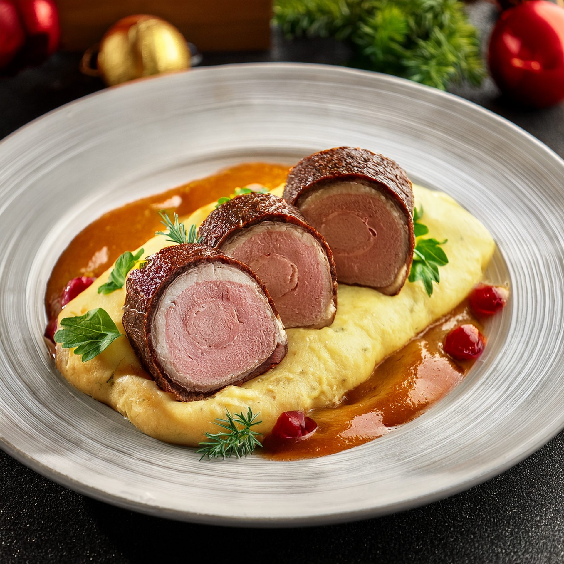 Roulade de bœuf, jambon et fromage accompagné d’une mousseline de pomme de terre et de légumes