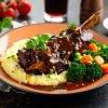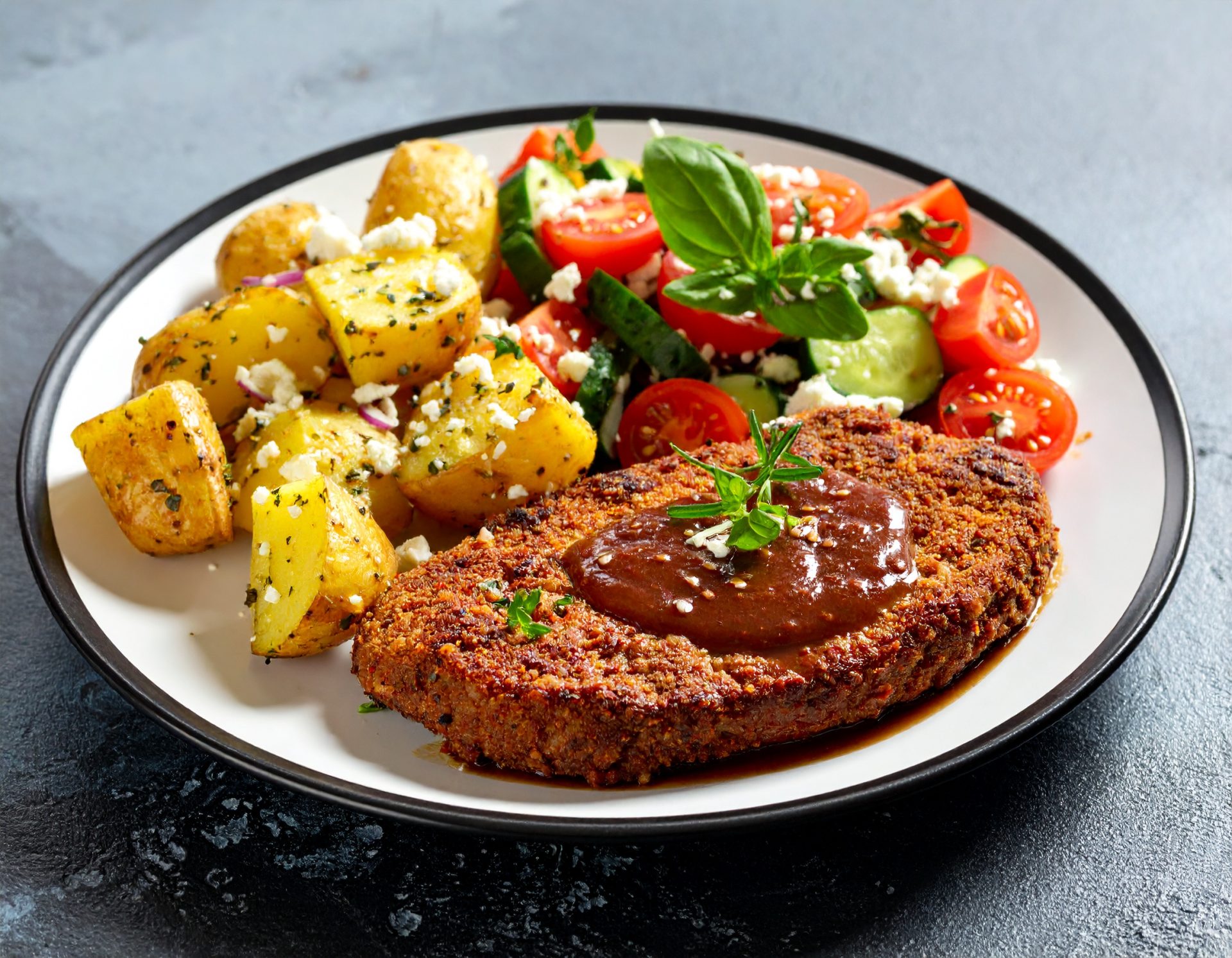 Salisbury steak de porc, accompagné de pomme de terre style grec et légumes du marché