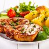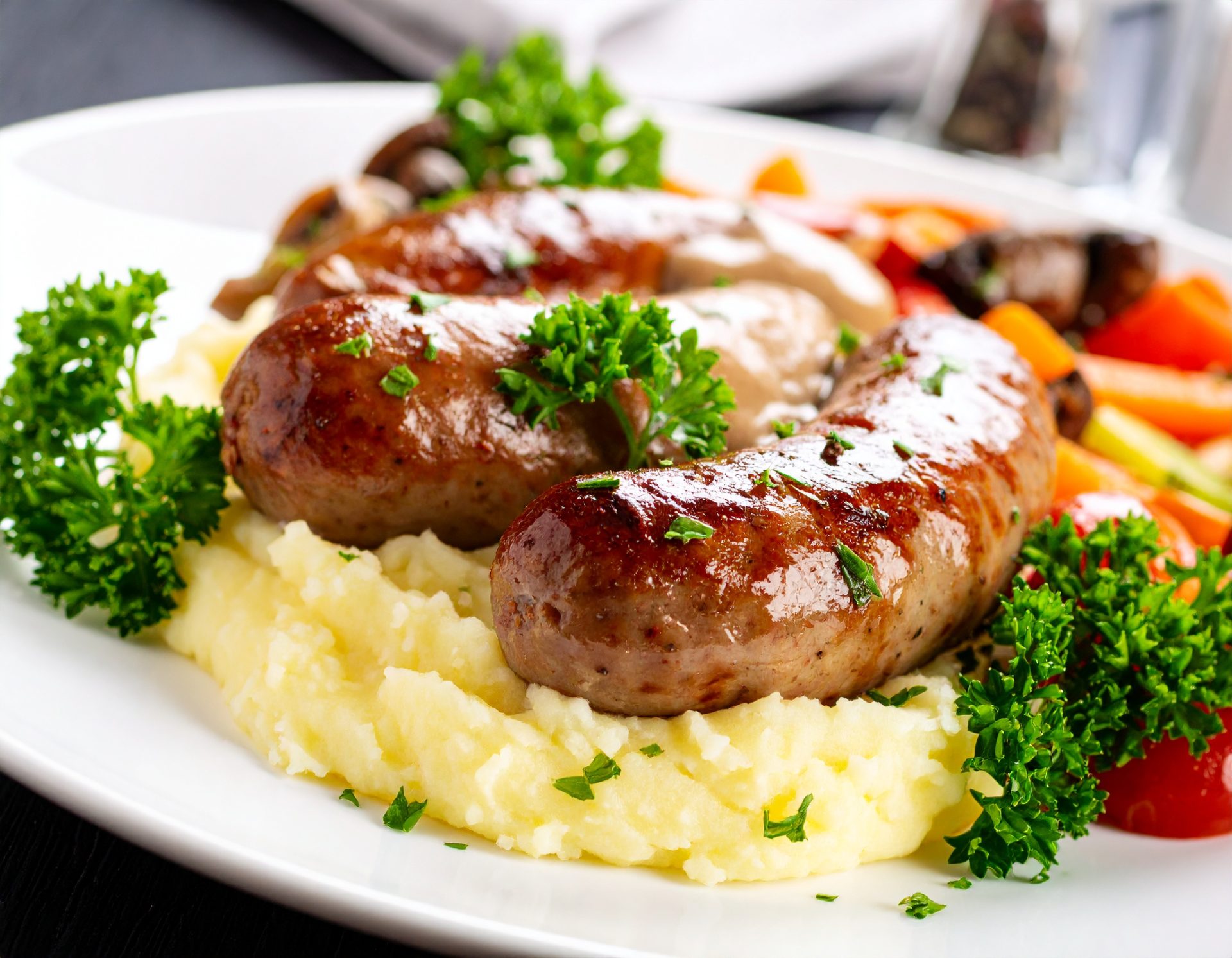 Saucisse de veau rôti, sauce aux champignons accompagnée de pomme de terre en purée et légumes du marché