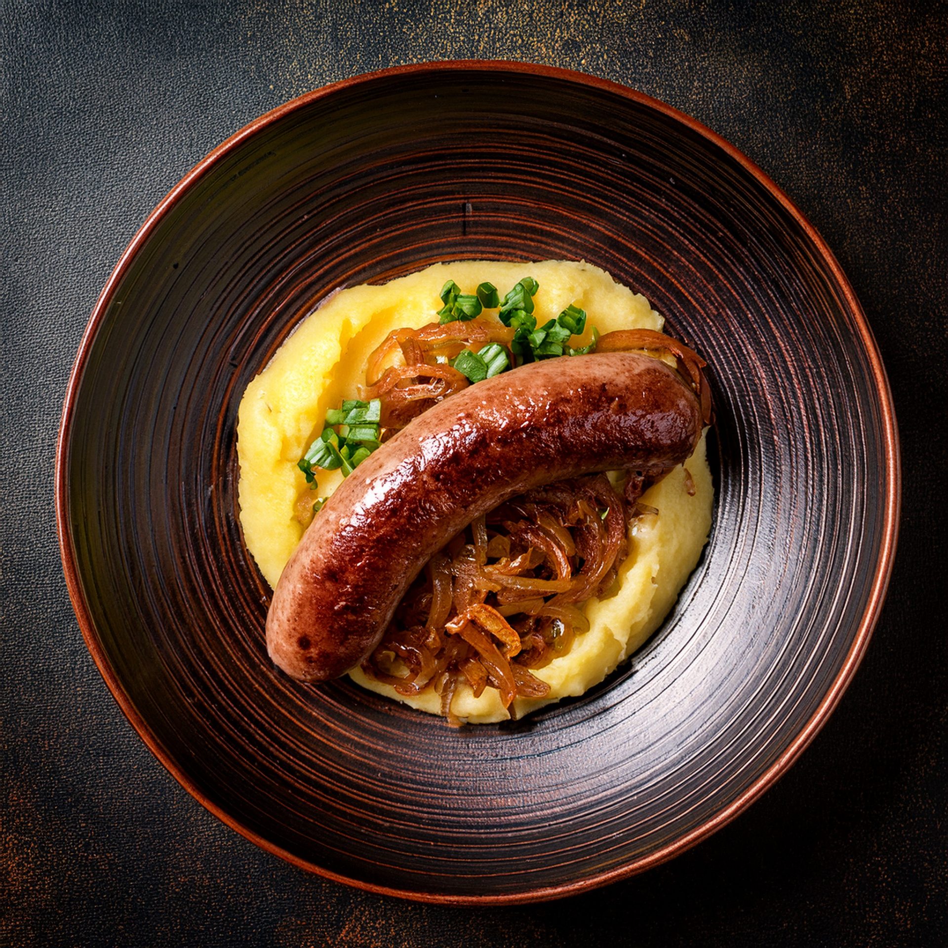Saucisse maison pure bœuf façon Montréal et oignons caramélisés servie avec mousseline de pomme de terre et légumes