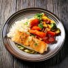 Saucisse merguez servie avec couscous, sauce à l’ail et légumes